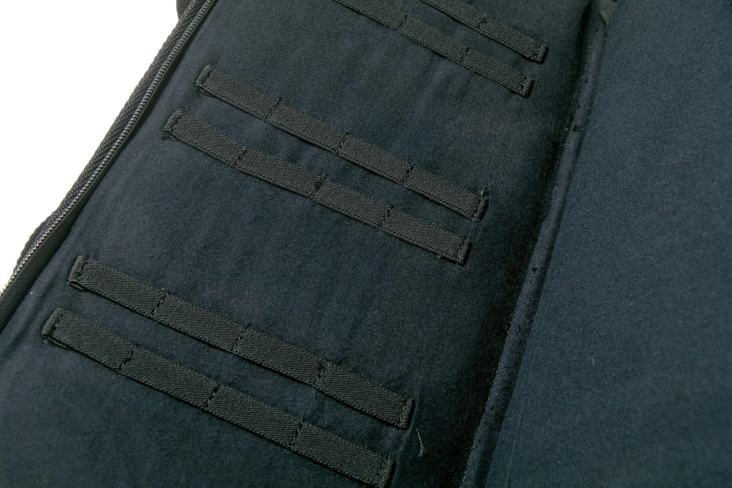 Le Case Small Leather Knife Case 01074 est une pochette de luxe permettant de transporter 24 couteaux de poche (Case). À l’intérieur se trouve deux faces avec des boucles. Chaque face peut contenir jusqu’à douze couteaux pour un total de 24. L’épais rembourrage et le rabat central assurent que les couteaux sont protégés et ne se touchent pas. La fermeture éclair maintient la pochette correctement fermée. Parfait pour ranger et transporter votre collection de couteaux Case.