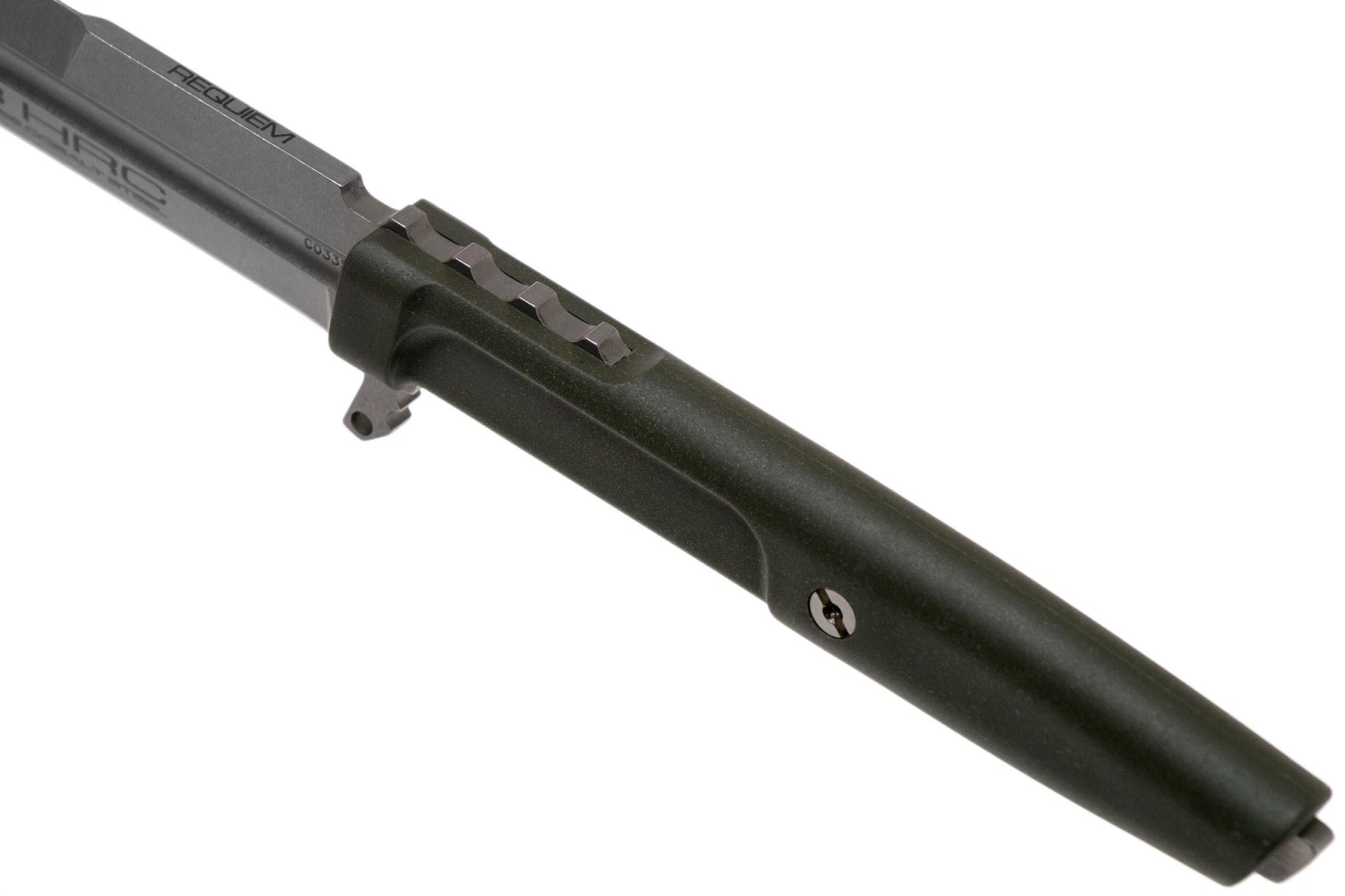 L’ Extrema Ratio Requiem est un couteau fixe fin qui rappelle la stiletto italienne. Son design fin permet de le porter en toute discrétion. Avec un poids d’à peine 85 grammes, c’est l’un des modèles les plus légers chez Extrema Ratio. Le manche n’est pas fixé via des vis sur le côté, comme chez la plupart des couteaux fixes, mais avec une seule vis au bout.