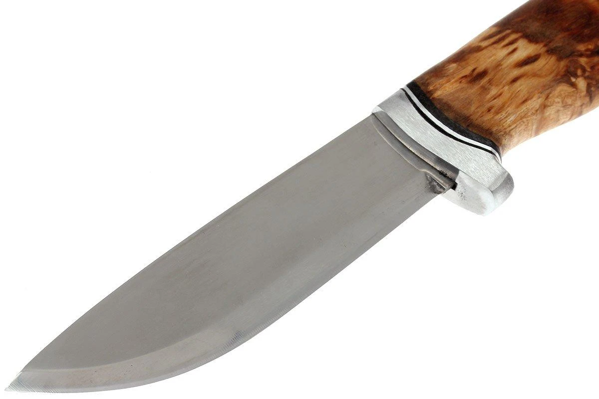 Le Helle GT 36 est l’un des plus grands couteaux de la gamme Helle. NĂ©anmoins, le poids dĂ» Ă la coque en aluminium et Ă l’absence de garde est relativement faible. Cette mitre en aluminium offre non seulement un soutien supplĂ©mentaire pendant l’utilisation, mais aussi une sĂ©curitĂ© supplĂ©mentaire pour vos doigts. Le manche est fait de bois de bouleau ondulĂ©. FormĂ© Ă la main, poli et huilĂ© pour donner au manche son caractère unique. La lame est en full-tang, ce qui signifie que l’acier continue jusqu’Ă l’extrĂ©mitĂ© du manche. En ce qui concerne l’acier, le choix s’est portĂ© sur l’acier carbone laminĂ© 3 couches.