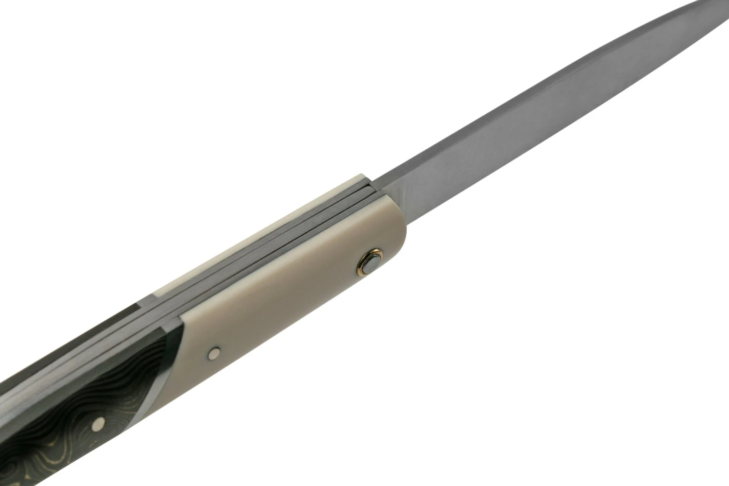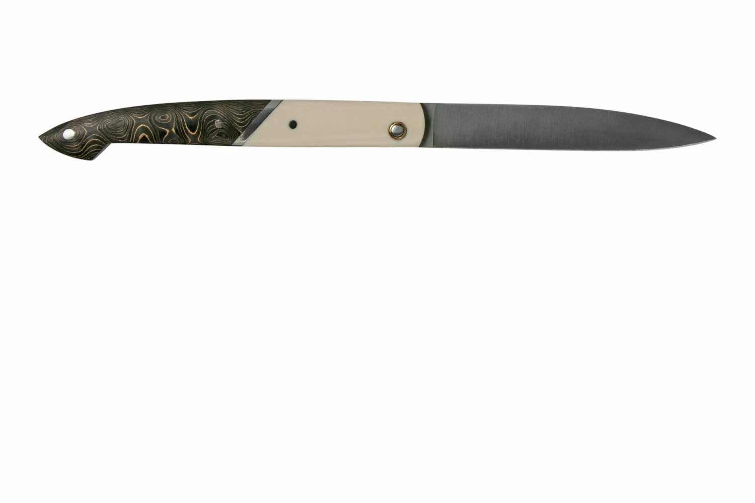 Le Laguiole en Aubrac Capucin Elforyn Copper Carbon Fibre est un petit couteau de poche français au design classique, avec des matériaux modernes. Ce couteau a un manche en Elforyn blanc, avec de la fibre de carbone et des couches cuivrées. Chaque couteau de poche est fabriqué à la main pour garantir une finition des plus incroyables.
